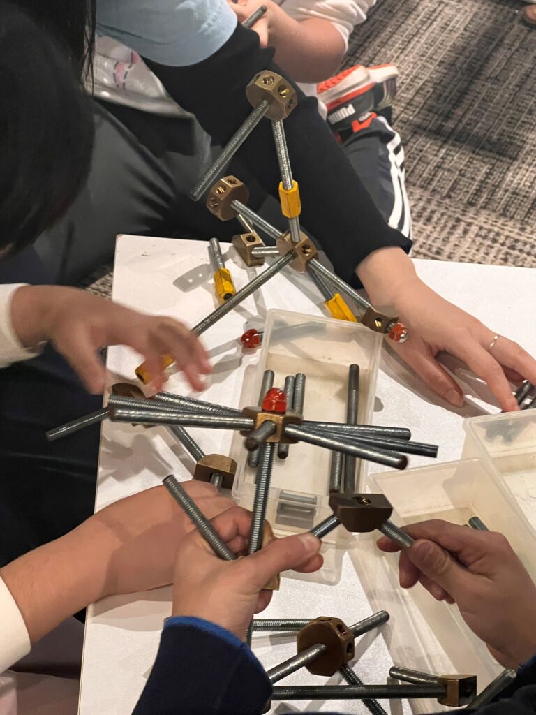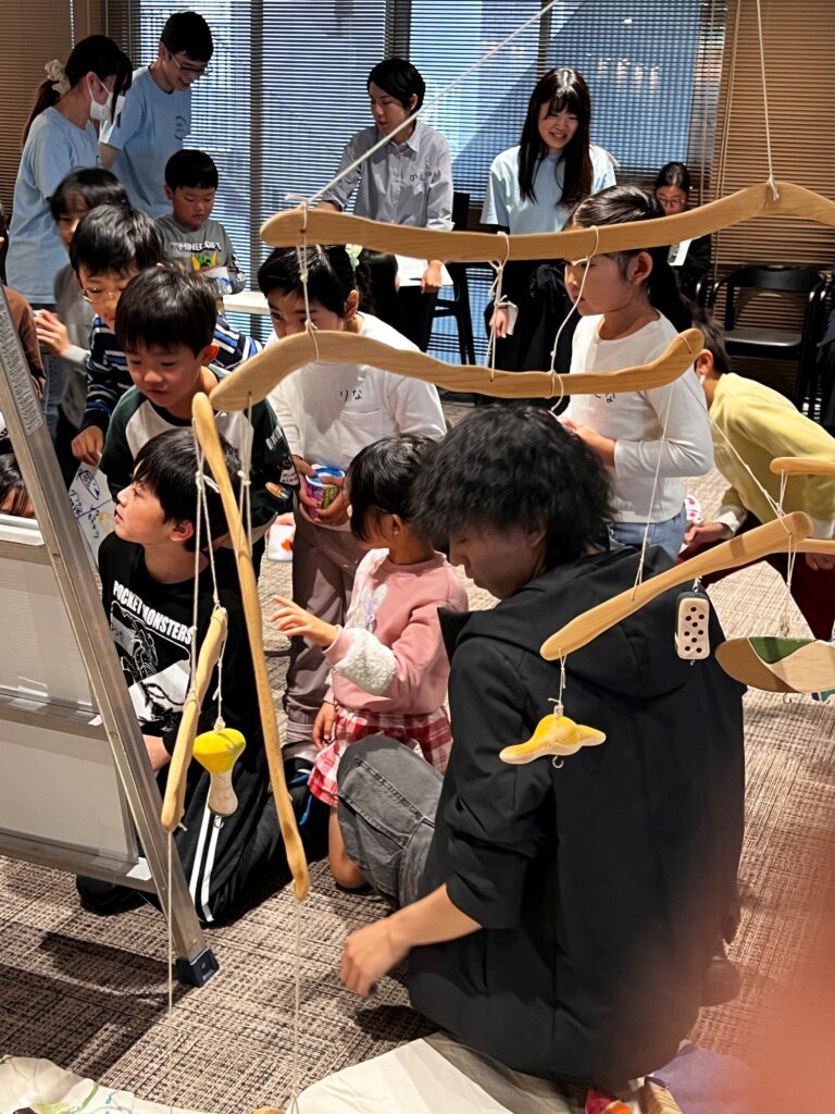 色紙をつなげてタワーを作ったり、ネジやボルトを組み合わせてとても頑丈そうなまるで“怪獣”を作ったり、車輪のような形状にしたものを坂から転がすことをひたすら繰り返したり、ずっと同じ遊びに夢中になって取り組んでいる子もいれば、ちょっとやってみてすぐに飽きて他のところに移っていく子もいます。ちょっと移り気なそんな子も、なにがどう作用するのか、“お気に入り”を見つけると突然“集中!”が始まります。大きなモビールでは、ひとりの子が片方に何かをつけると傾いてしまい、他方に何かを付けなくては平均が保てません。そこでは、自然と“共同作業”が生まれました。