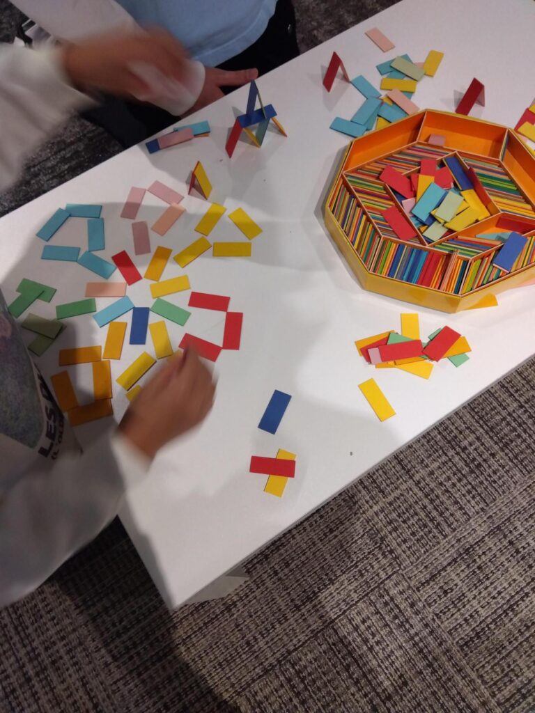 それもそのはず、LOOP会場には、色紙がぎっしり詰まったボックス、たくさんの鉄棒・ネジやボルトの集まり、色とりどりのボールが収まったボード、なにやら磁石がしかけてあるらしいボード板、いろいろな形の黒くてちょっと厚い紙片、スクリーンに投影すると綺麗な画像になる色セロハン、丸い色板を棒にさして坂道を転がすと‥‥。計10種類のさまざまな“もの”が用意されていましたので、当然、目はあちらこちらへ。