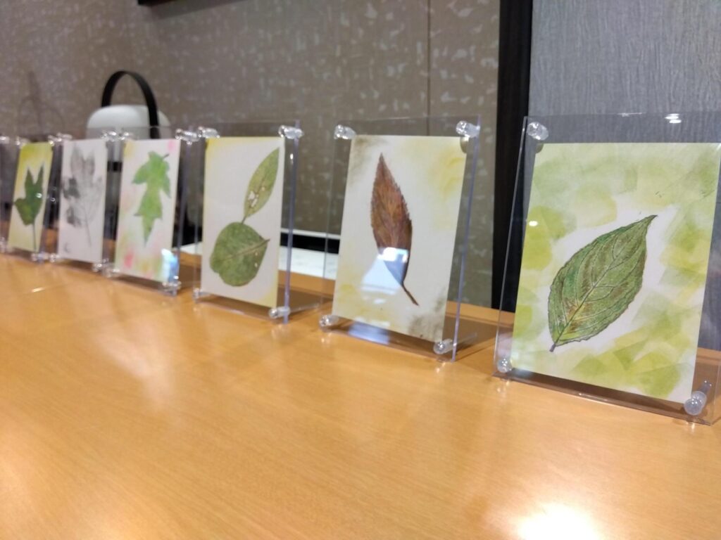 群馬さんはひとりひとりのテーブルを回って、アドバイスし、時に一緒に作業をして、参加者14人の葉っぱが完成していく過程を伴走していました。そして、作業すること、2時間半。みなさんの「葉っぱ」が完成しました。用意していただいたフレームに入れると、立派な「葉っぱ」のできあがり。選ぶ葉っぱも違えば、描く色も描き方も人それぞれ。ずらっと並べると、それはそれは見事な「葉っぱ」ストリートができあがりました。